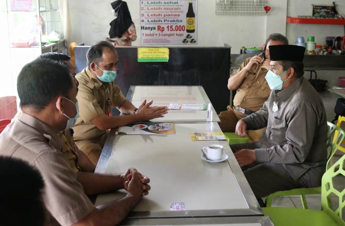 Bupati Siak Alfedri, ditemani Kepala BKD Muzamil, berbincang dengan Kepala Bapenda Riau Herman bersama timnya di salah satu kedai kopi di Mempura, terkait realisasi PAD yang akan diperoleh jika menjemput bola.