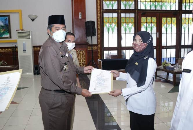 RIAUMANDIRI.CO, SIAK - Bupati Siak Alfedri menyerahkan surat keputusan (SK) pengangkatan Calon Pegawai Negeri Sipil (CPNS) formasi umum tahun 2019 di lingkungan Pemerintah Kabupaten Siak.
