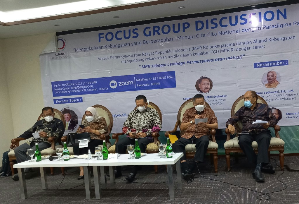 FGD diselenggarakan MPR yang diawali penyampaian kaynote spech oleh Ketua MPR Bambang Soesyatyo (Bamsoet). Pembicara lainnya Diani Sadiawati (Staf Ahli Menteri PPN/Kepala Bappenas Bidang Hubungan Kelembagaan) dan Moch.Nurhasim (Asosiasi Ilmu Poliik Indonesia).