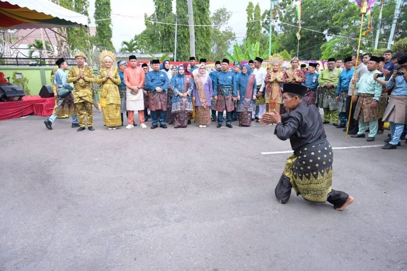 Usai melewati jajaran bunga manggar, rombongan Bupati Kasmarni yang didampingi Wakil Bupati dan Bupati ke-14 Bengkalis Amril Mukminin dan unsur Forkopimda Kabupaten Bengkalis dan diapit oleh bujang dan dara disambut dengan silat sambut.