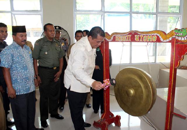 Bupati Inhu H Yopi Arianto, SE memukul gong tanda dicanangkannya Pasir Penyu sebagai Kecamatan Layak Anak.