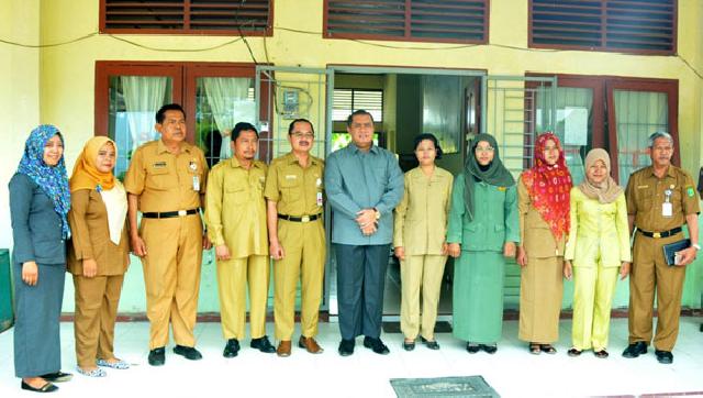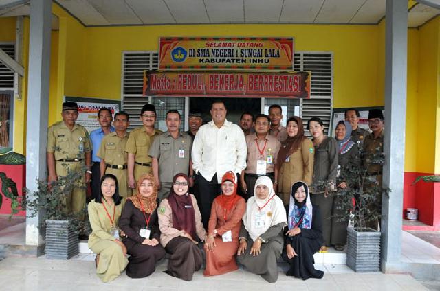 Bupati Inhu H Yopi Arianto, SE didampingi Asisten Pemerintahan dan Kesra Drs H Asriyan MSi dan Kepala Dinas Pendidikan Inhu H Ujang Sudrajat SP MSi berfoto bersama dengan Camat Sungai Lala Yus Amrina serta kepala sekolah dan majelis guru SMAN 1 Sun