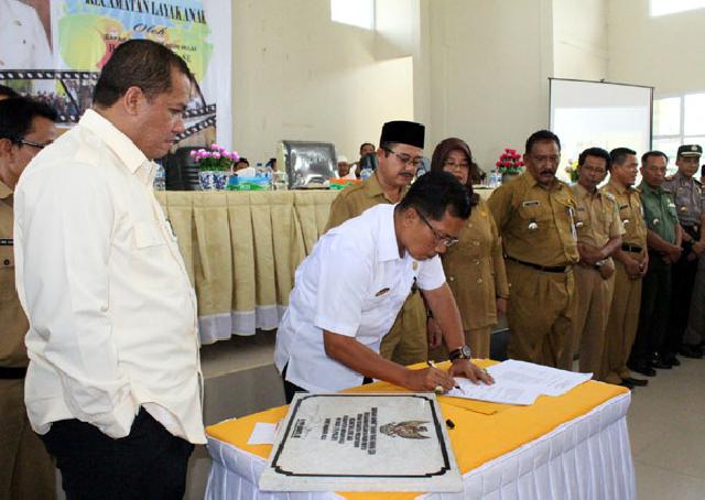 Bupati Inhu H Yopi Arianto, SE menandatangani prasasti pencanangan Pasir Penyu sebagai percontohan Kecamatan Layak Anak.