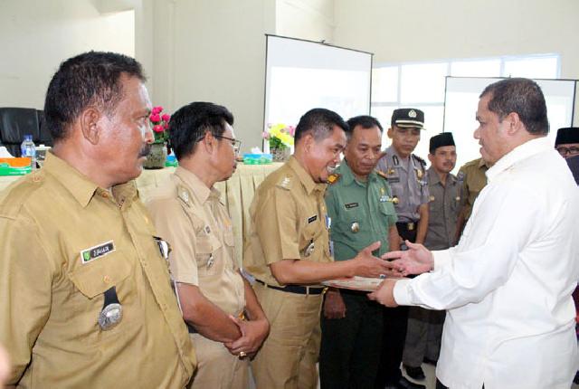 Bupati Inhu H Yopi Arianto, SE menyerahkan piagam penghargaan kepada Camat Pasir Penyu Syahruddin, MT.
