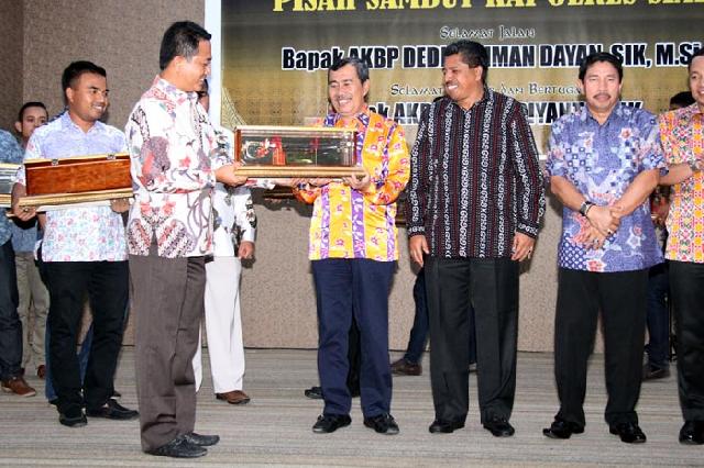 Mantan Kapolres Siak Kapolres Siak AKBP Dedi Rahman Dayan menerima cenderamata dari Bupati Siak H Syamsuar dan Wabup H Alfedri dalam acara pisah sambut.