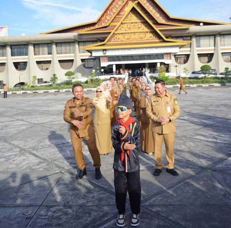 Tampak di halaman Kantor Gubernur Riau, pagi itu suasana berubah menjadi meriah penuh sorak-sorai. Usai kegiatan apel, Gubernur Riau Abdul Wahid bersama seorang bocah viral asal Kuantan Singingi, Rayyan Arkan Dikha, mempersembahkan tarian Pacu Jalur di hadapan seluruh pegawai.
