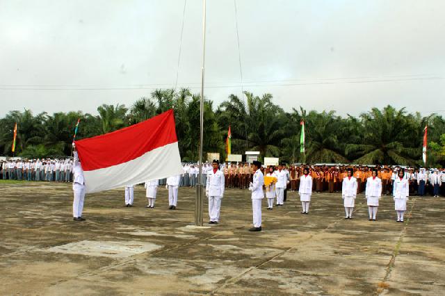 Ketua PGRI Inhu, Hardimis selaku perwira Upacara melaporkan upacara siapa di Mulai kepada Penjabat Bupati Inhu, Kasiarudin