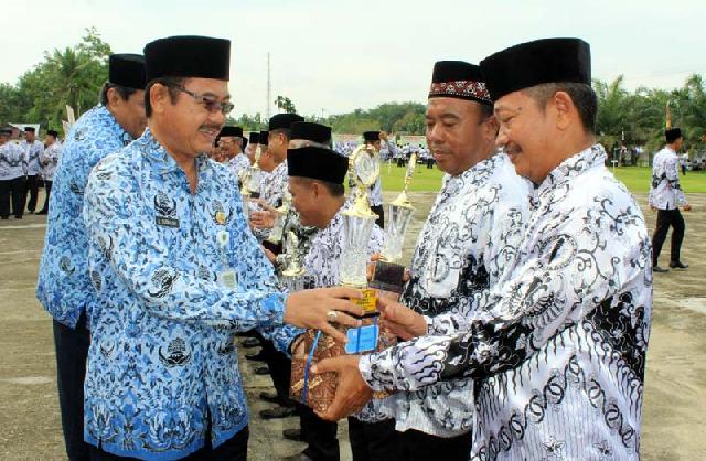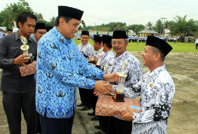Penjabat Bupati Inhu, memberikan hadiah kepada pemenang lomba HUT Guru
