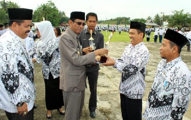 Kadisdik Inhu, Ujang Sudrajat memberikan hadiah kepada pemenang lomba HUT Guru
