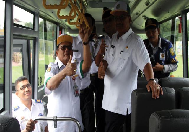 Bupati Sukarmis Naiki Bus Bantuan Kemenhub
