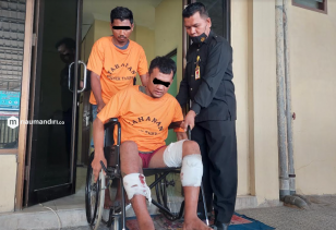 RIAUMANDIRI.CO - Pria inisial RN alias Rahmad duduk di kursi roda keluar dari sel tahanan Kepolis.