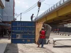 RIAUMANDIRI.CO, PEKANBARU (HR)- Satu unit truk kontainer terguling di Jalan Sudirman Ujung, Pekan.