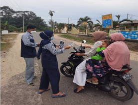 Ikuti Tren, Mahasiswa Kukerta Unri Bagi-Bagi Konektor dan Strap Masker di Desa Geringging Jaya